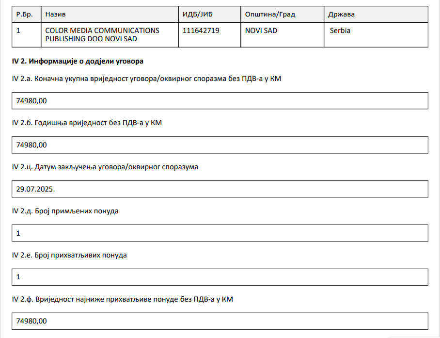 Indikativno je da se na tender javio samo jedan ponuđač, i to iz druge države – Color Media Communication publishing company iz Novog Sada, u vlasništvu Roberta Čobana, „kralja tabloida“.