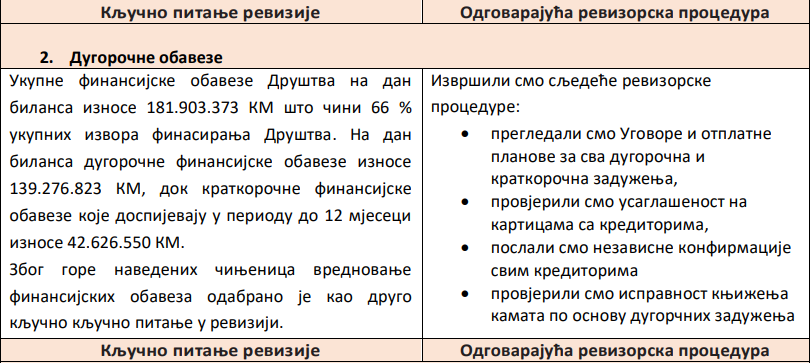 Izvještaj takođe kaže da su dugoročne obaveze OCJ gotovo 140 miliona maraka, kratkoročne 42 miliona, a dobit oko 158.000 maraka.