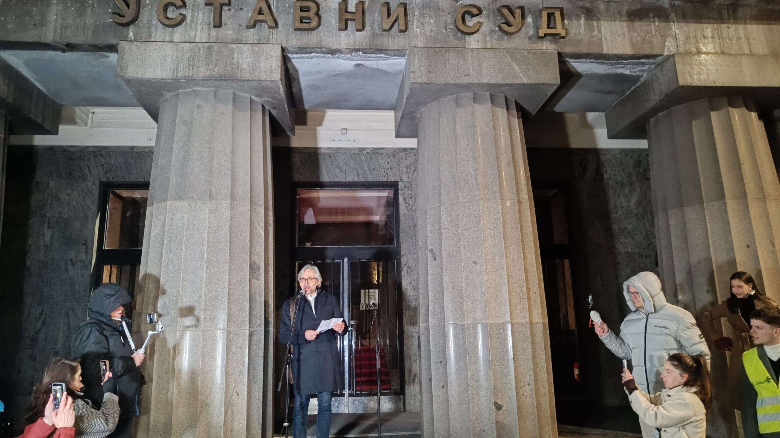 Na skupu ispred Ustavnog suda u Beogradu tužilački saradnik Rade Bajić iz Javnog tužilaštva za organizovani kriminal (TOK) je rekao da su krajem 2024. godine primili anonimnu krivičnu prijavu u vezi sumnje da su najviši predstavnici izvršne vlasti, koji su od 2022. do 2024. godine bili na čelnim pozicijama ukupno četiri ministarstva i nekoliko drugih organa državne uprave, izvršili brojne zloupotrebe i falsifikovanja u cilju protivustavnog i protuzakonitog ukidanja svojstva kulturnog dobra zgradama Generalštaba u Beogradu.