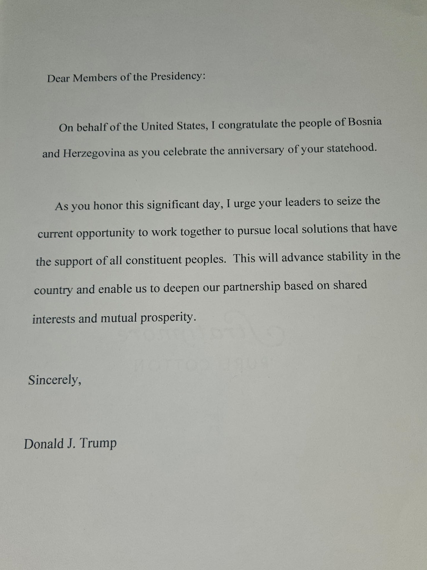 – S poštovanjem, Donald J. Trump, stoji u čestitci naslovljenoj na predsjedavajućeg Željka Komšića.